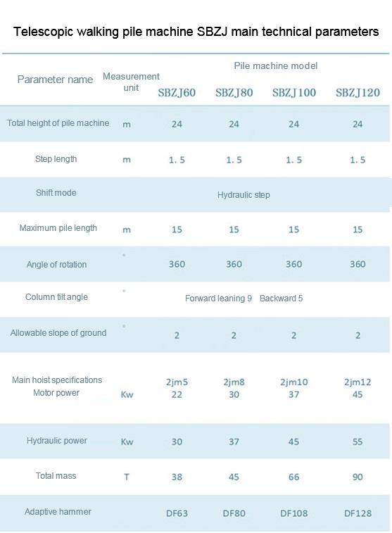 SBZJ series telescopic boom type walking pile machine gathers all the experts, the upper column can be retracted and replaced in transportation, saving a lot of expenses and trouble in hoisting and disassembly and assembly; when turning at short distance, it is convenient and fast to perform its own steps, saving time and cost. Efficient, economical and practical. It can be used in many kinds of working equipments, such as guide rod diesel hammer, cylinder diesel hammer, vibration hammer, hydraulic hammer, long screw drill, etc.